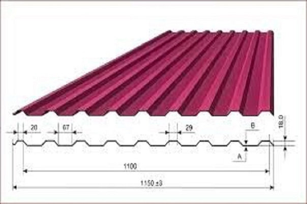 На данный момент покрытие из профнастила широко распространено. Это покрытие является наиболее оптимальным в соотношении цена/качество. Срок службы профлиста зависит от многих параметров и колеблется от 30 до 150 лет. На сегодняшний день профлист подразделяют на 2 группы: стеновой и кровельный. По промышленной классификации к стеновым относятся гофры С8, СС10, СП20, С21, С44. К кровельным НС35, Н57, Н60, Н75, Н114. На практике часто на кровлю используют начиная от СС10. В обозначении типа профлиста буква обозначает назначение (стеновой или настильный), цифра говорит о высоте волны. Например, С21 означает стеновой профиль с высотой гофры 21 мм. Также на данный момент в частном домостроении на кровлю широко используют декоративное покрытие – металлочерепица. Профлист СП20 Этот тип профлиста предназначен для ограждений. Также им кроют кровли с большим уклоном и сплошной обрешеткой. Габаритная ширина 1150 мм., монтажная 1100 мм.